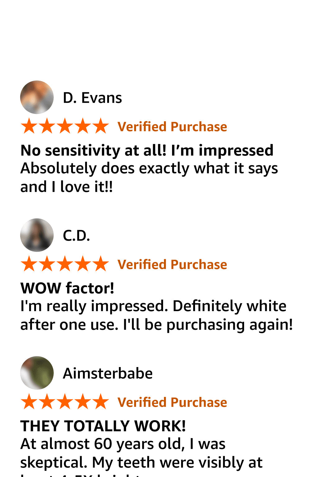 Other strips will whiten my teeth for a day but them return to my normal colour but these strips have maintained a super white colour for weeks! As soon as I finish this box I will be purchasing more!